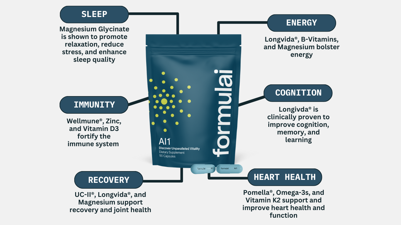 Formulai AI1 replaces multiple supplements with one powerful formula, offering a smarter, more efficient way to achieve optimal health and performance.