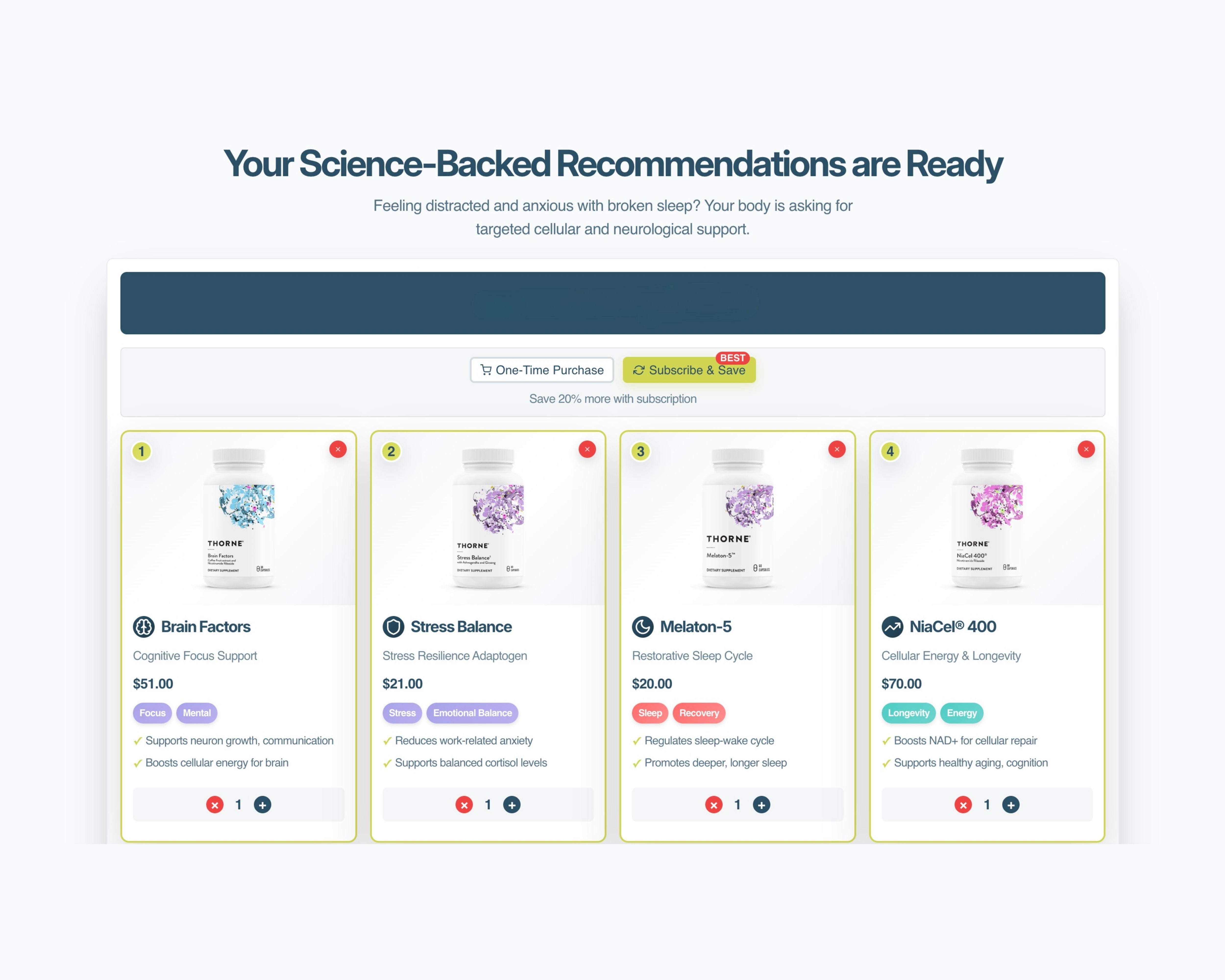 We source vetted, science-forward health and wellness brands in one place and pair them with personalized insights so you can shop smarter and with confidence.