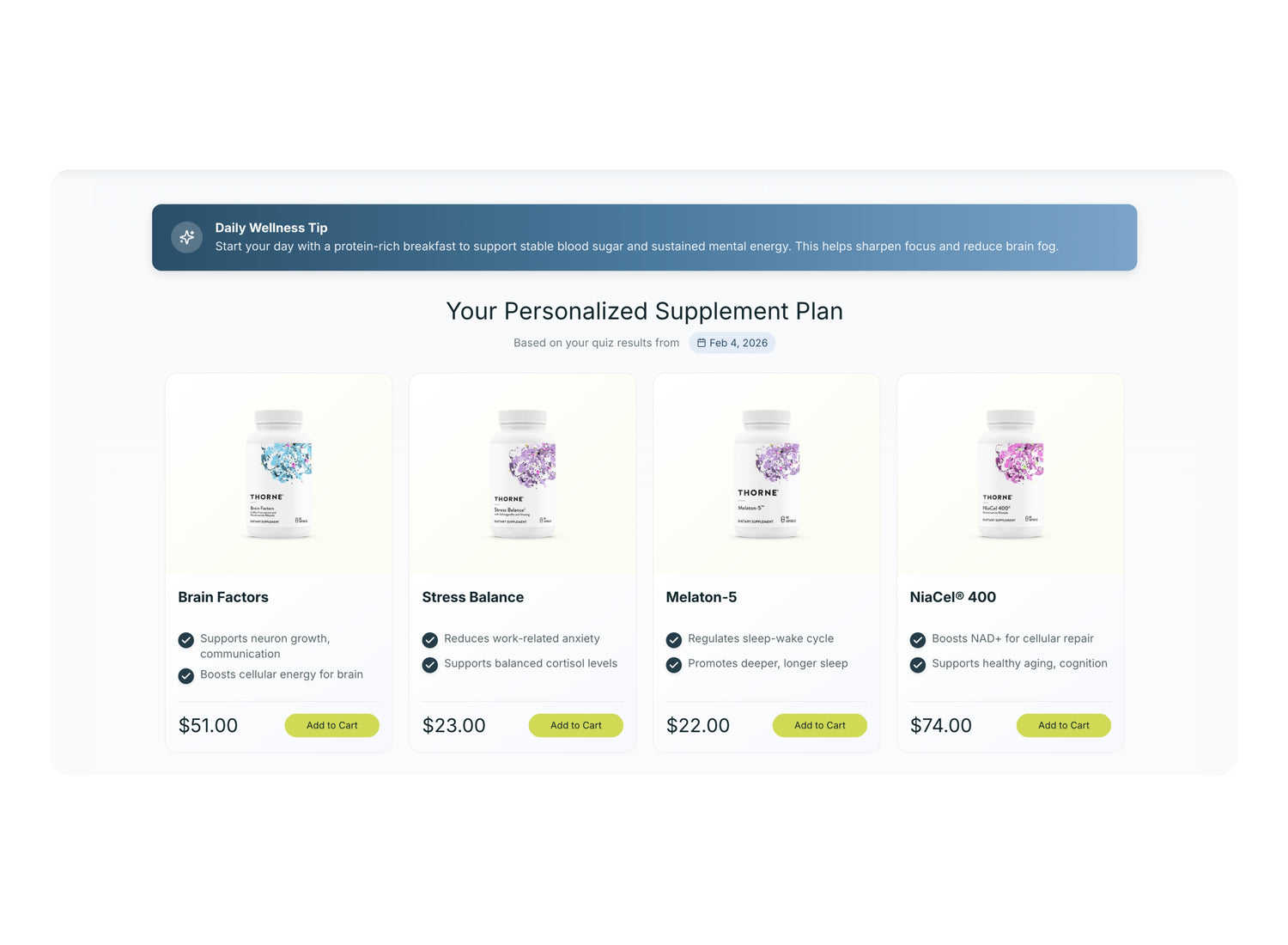 Products appear within personalized stacks tied to customer goals. Each product page includes contextual insights explaining why it was recommended, increasing clarity and perceived value.