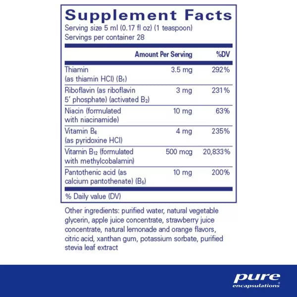 This convenient and great-tasting liquid formula provides a comprehensive blend of essential B vitamins — including B1, B2, B3, B5, B6, and B12 — to promote energy production, nervous system health, and the integrity of the skin, hair, and liver.‡