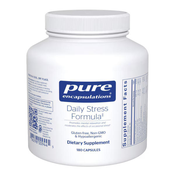 Daily Stress Formula is a comprehensive blend of vitamins, minerals, amino acids, and botanicals designed to support mental relaxation and resilience during times of occasional stress.‡ With calming herbs like chamomile and lemon balm alongside adaptogens such as rhodiola and ashwagandha, this formula helps moderate mild fatigue, supports energy metabolism, and promotes cognitive function.‡