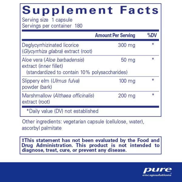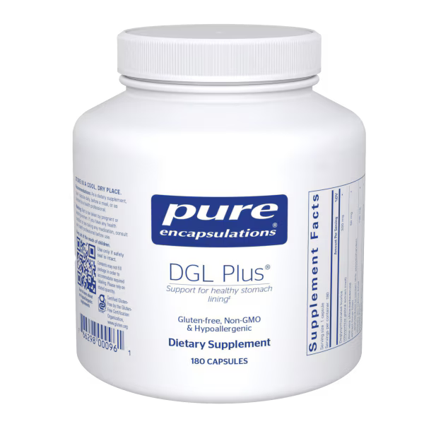 DGL Plus® combines deglycyrrhizinated licorice (DGL) with soothing herbal extracts, including aloe vera, slippery elm, and marshmallow root, to support the gastrointestinal tract. This synergistic formula helps stimulate the quality and production of stomach mucus, promoting a healthy stomach lining and the body’s natural defense mechanisms—without the side effects typically associated with licorice.