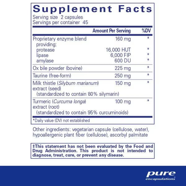 Combines bile salts, taurine, enzymes, and botanicals for synergistic support
