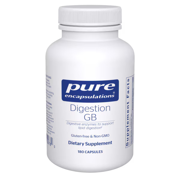 Digestion GB is a targeted formula that combines bile salts, taurine, enzymes, and herbal extracts to support gallbladder health and fat utilization. By aiding lipid digestion, this unique blend helps promote overall digestive efficiency and comfort. Part of the PureGI™ product line, it is designed to maintain optimal gallbladder and gastrointestinal function.