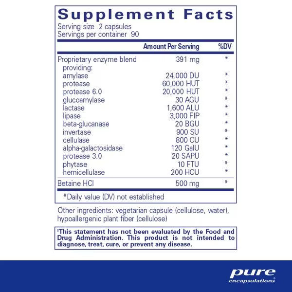 Digestive Enzymes Ultra with Betaine HCl offers comprehensive support for healthy digestion by combining a broad-spectrum blend of vegetarian enzymes with betaine HCl. This powerful formula promotes efficient breakdown of proteins, fats, carbohydrates, fiber, and dairy, while also supporting optimal gastric pH for enhanced nutrient absorption.