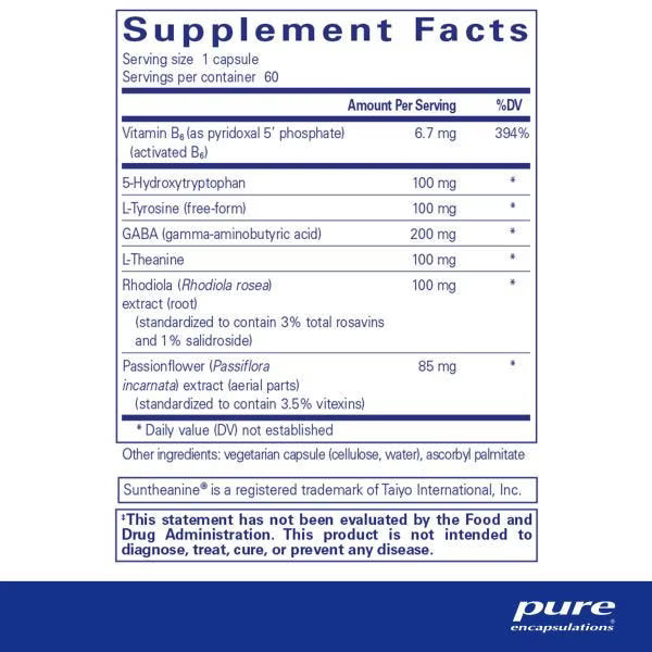Features 5-HTP, l-theanine, passionflower, rhodiola, and activated B6