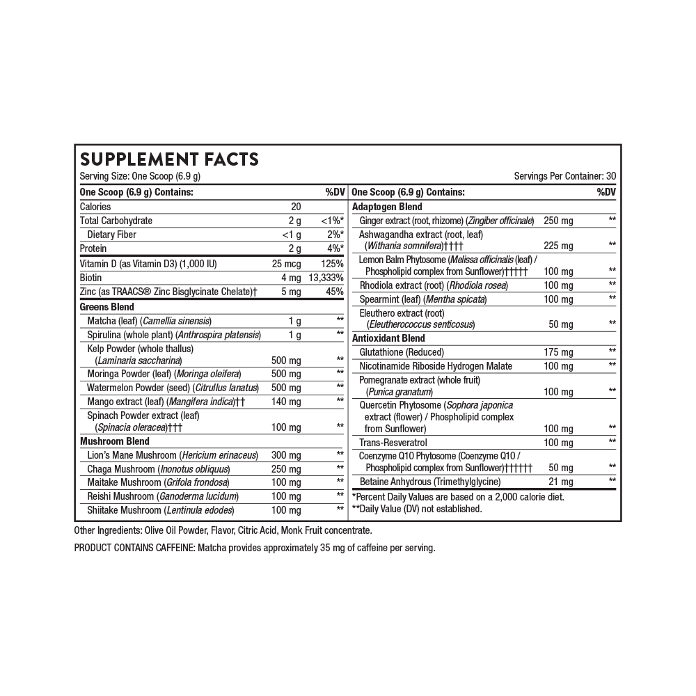 - Features ingredients like matcha, rhodiola, and spirulina*