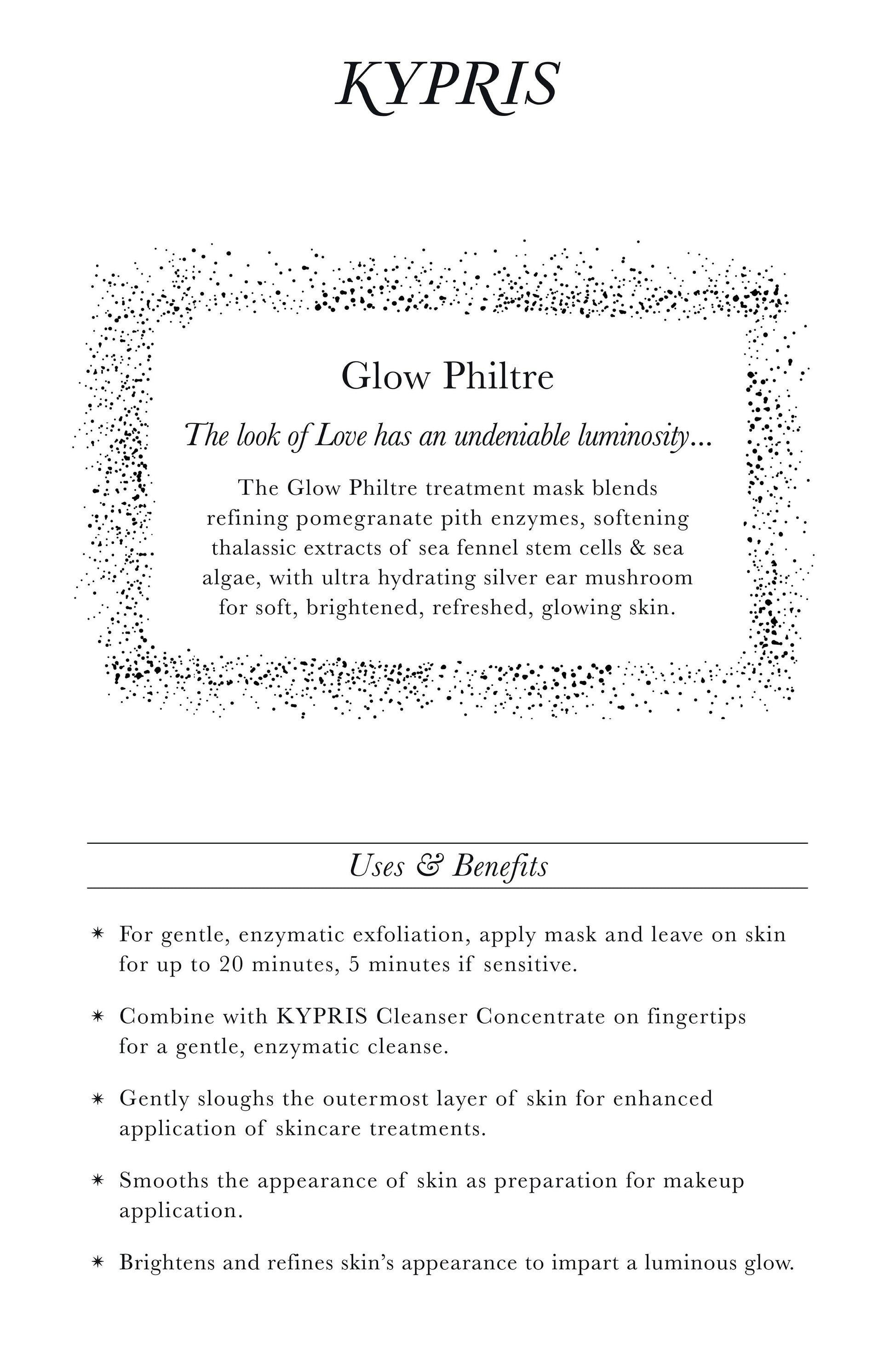 The look of love has an undeniable luminosity. Glow Philtre is a radiance-boosting treatment mask that gently refines, softens, and hydrates for visibly refreshed, glowing skin. This indulgent formula blends fruit enzymes, oceanic botanicals, and ultra-hydrating silver ear mushroom to renew the skin’s appearance with gentle exfoliation and rich moisture.