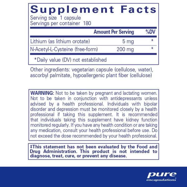 Lithium (orotate) is a trace mineral supplement that combines lithium with N-acetyl-l-cysteine (NAC) to support emotional wellness, mood balance, and cognitive health. It also promotes healthy neurotransmitter activity for optimal mental performance.*