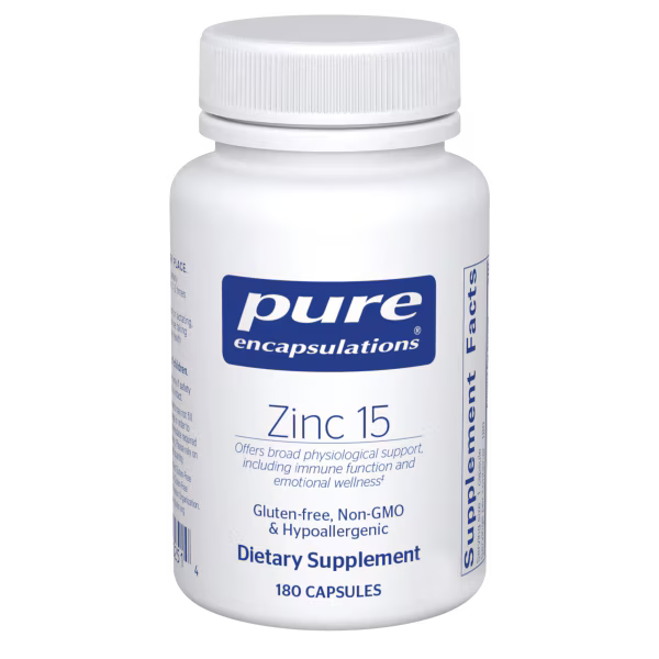 Zinc 15 delivers a highly absorbable form of zinc to promote immune defenses, collagen formation, healthy tissue development, and reproductive health. This versatile trace mineral also supports enzymatic digestion, metabolism, and overall emotional wellness.‡